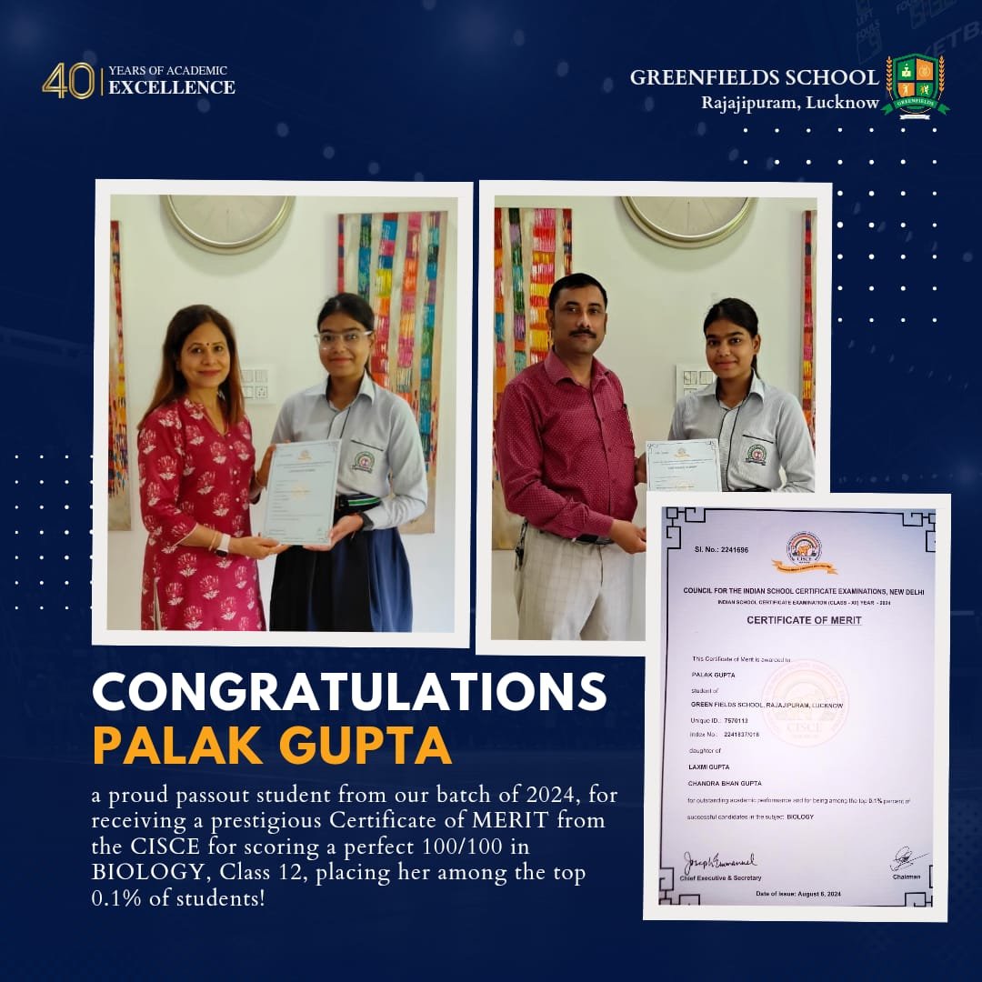 Congratulations to Palak Gupta, a proud passout student from our batch of 2024, for receiving a prestigious Certificate of MERIT from the CISCE for scoring a perfect 100/100 in BIOLOGY, Class 12, placing her among the top 0.1% of students!