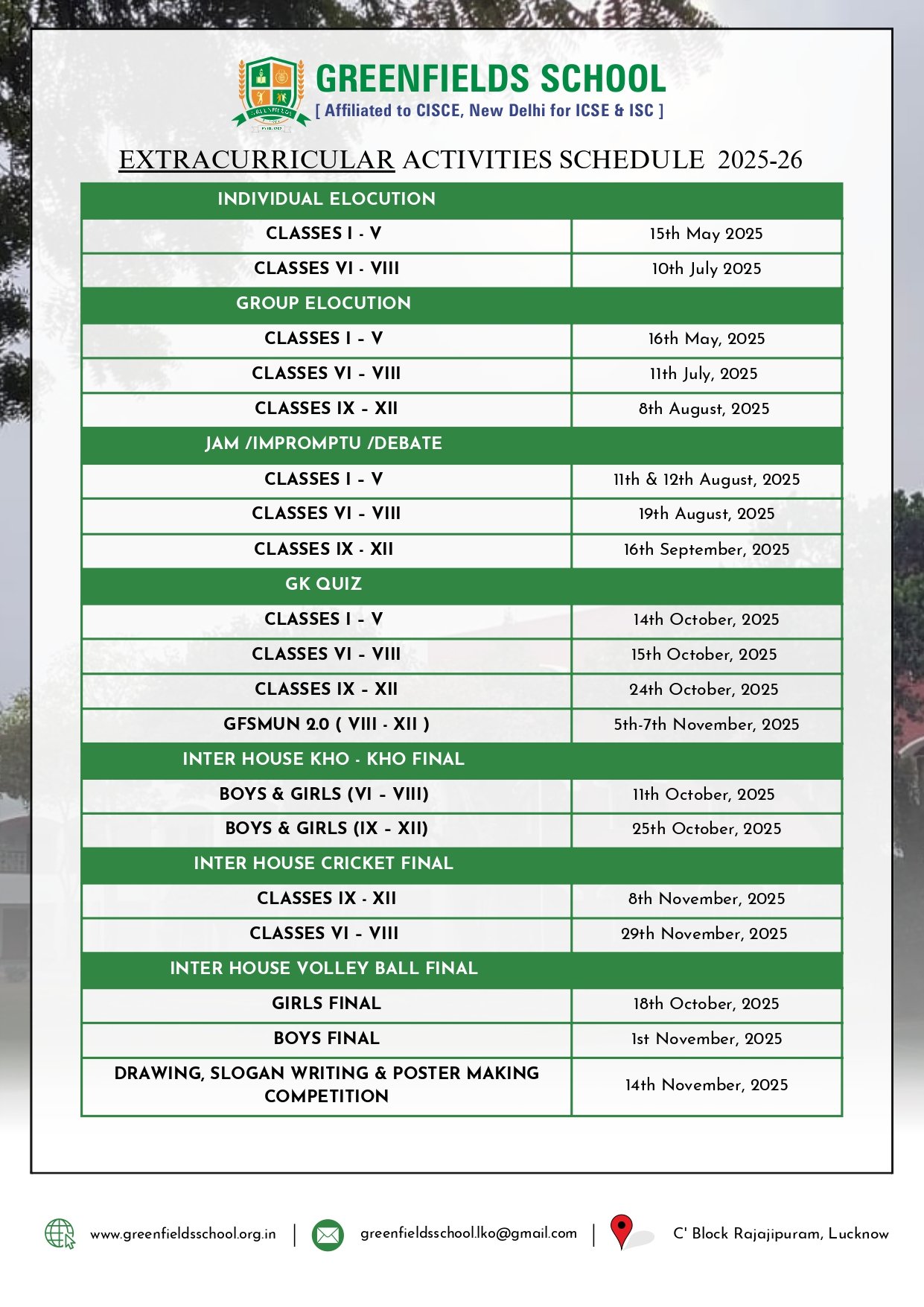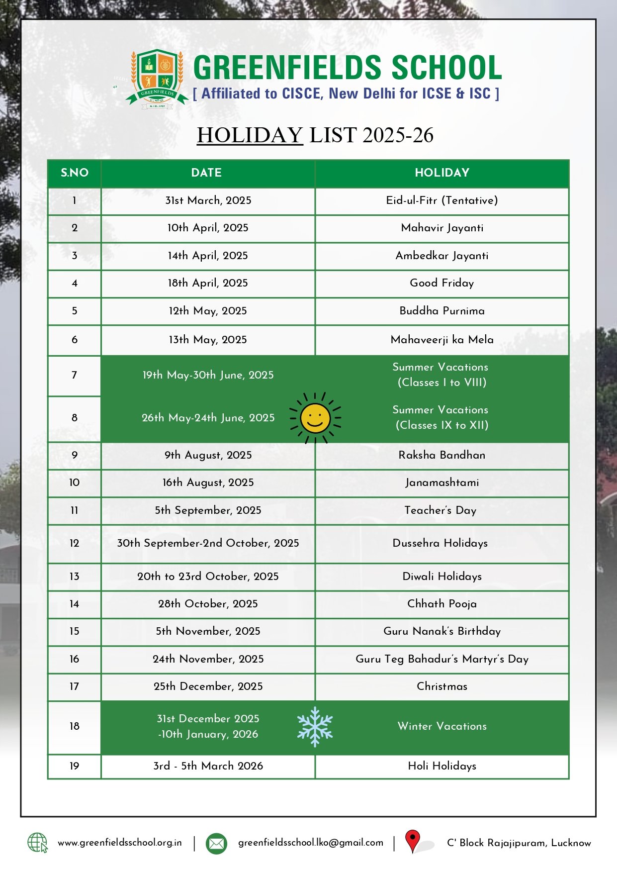 HOLIDAY LIST 2025-26 Curriculum - Primary - junior - Senior School calendar 2025 - 2026 Booklist 2024 - 2025 Gems of Greenfields School HOLIDAY LIST 2025-26 Curriculum - Primary - junior - Senior School calendar 2025 - 2026 Booklist 2024 - 2025 Gems of Greenfields School